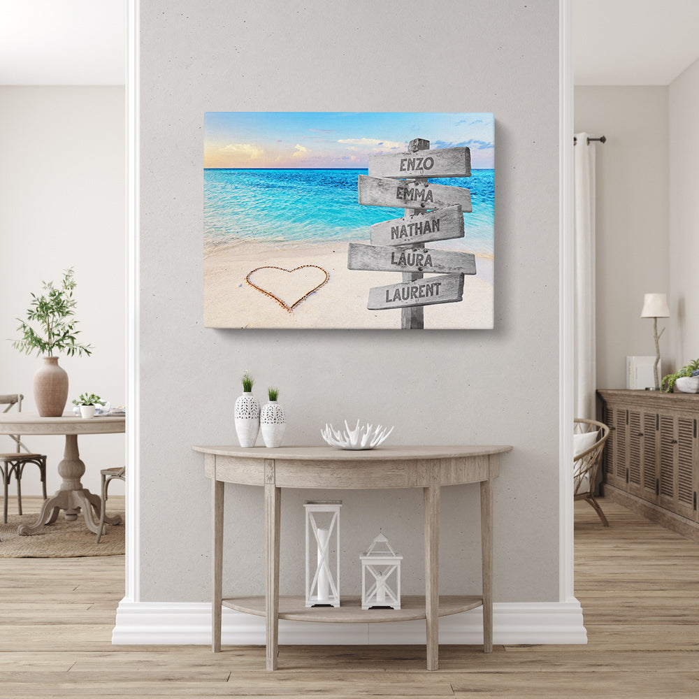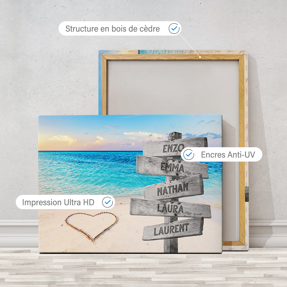 Tableau personnalisé famille, Prénom, Panneaux, Plage Cœur